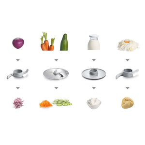 | Scope of Delivery | Mixing bowl, continuous slicer shredder (cutting disc, rasping disc, whisk disc), dough hook, knife insert |